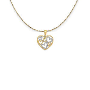 Heart of hearts, an exquisite open and diamond cut design fashioned from 14k yellow gold with white rhodium plating. It measures approximately 20mm wide by 23mm long including the tapered bail. Includes a 18 inch long, 0.9mm wide, solid 14k yellow gold cable chain with a spring ring clasp.