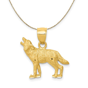 As a symbolic symbol, meaningful totem, or just because you love wolves this 14k yellow gold pendant is a winner. It features a two-dimensional open back design with a satin and diamond-cut finish that is approximately 19mm (3/4 Inch) in width by 18mm (11/16 inch) in length, which includes the tapered bail. The pendant is . Includes a 22 inch, 0.8mm 14k yellow gold cable chain with a lobster clasp.