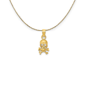 Tap into the trendy, edgy side of your style with this skull and crossbones pendant crafted from 14k yellow gold. It features a diamond-cut, open back design that measures approximately 8mm (5/16 Inch) wide by 19mm (3/4 Inch) long, which includes the tapered bail. Includes a 18 inch long, 0.9mm wide, solid 14k yellow gold cable chain with a spring ring clasp.