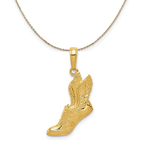 Start conversations wherever you go with a unique charm created to spark interest and reveal your passion for running. This polished 14k yellow gold pendant features a textured open back design that is approximately 15mm (9/16 inch) in width by 25mm (1 Inch) in length, which includes the tapered bail. Includes a 16 inch long, 0.9mm wide, solid 14k yellow gold cable chain with a spring ring clasp.