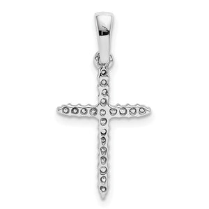 Celebrate and honor all special occasions with jewelry of religious significance! Our collection of spiritually inspired designs that show faith, hope and devotion are perfect for commemorating life's milestones. This dainty Latin cross pendant created in rhodium-plated 14k white gold features 21 round, 1.2mm diamonds totaling 1/6 carat. The natural untreated diamonds are I2 in clarity and I-J in color. The approximate size is 12mm (7/16 inch) in width 24mm (15/16 inch) in length with the bail. This item does not include a chain.