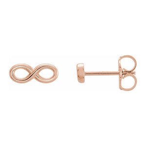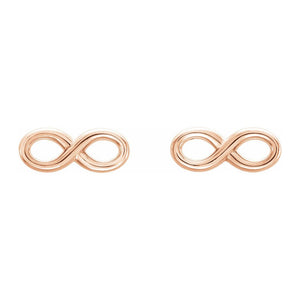The infinity loop symbolizes perfection, eternity, and everlasting love. These small stud style earrings are created from polished 14k rose gold and include friction backs. This is a made to order item and is estimated to ship in about 6-8 days. Please email service@theblackbow.com for more details.