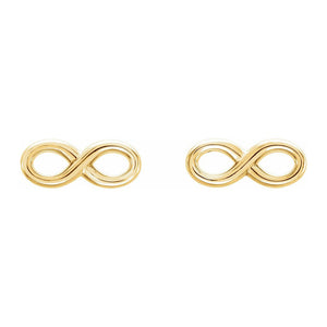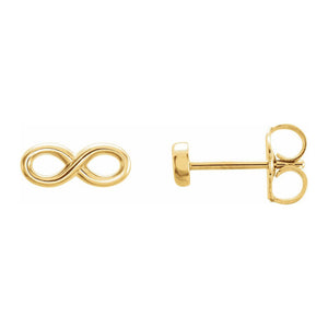 The infinity loop symbolizes perfection, eternity, and everlasting love. These small stud style earrings are created from polished 14k yellow gold and include friction backs.