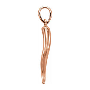 Tie the meaning to the moment with a classic or unusual pendant that makes it personal, thoughtful, or meaningful. This Italian horn pendant created from 14k rose gold features a solid 3-dimensional design. The approximate size is 6mm (1/4 inch) in width by 32mm (1 1/4 inch) in length including the bail. Chain passage dimensions approximately 3.5 x 2.8 mm. This item does not include a chain.