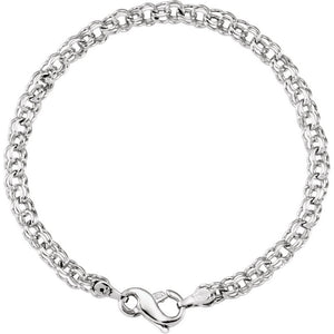• This classic paralleo cable chain bracelet features solid, open, double links ideal for hanging charms. It is fashioned from rhodium-plated 14k white gold, is 4.5mm in width by 7-inches in length and closes with a fancy lobster clasp.