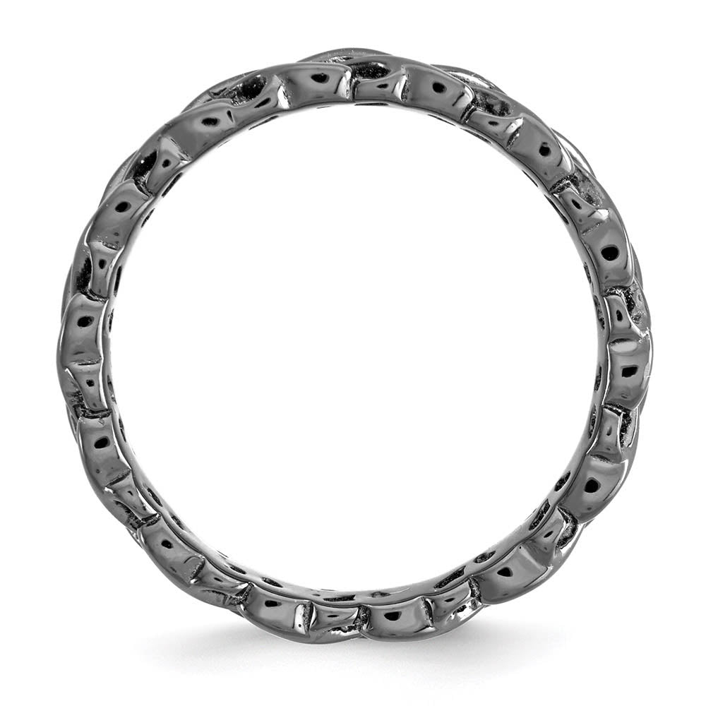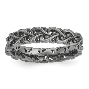 Make it simple and stylish with stackable bands of different textures, finishes, widths and colors! This black ruthenium plated sterling silver band features a carved intertwined heart design with a polished finish that measures 4. Mm wide. Guaranteed to fit together perfectly with all of the mix and match Stackable Expressions rings.