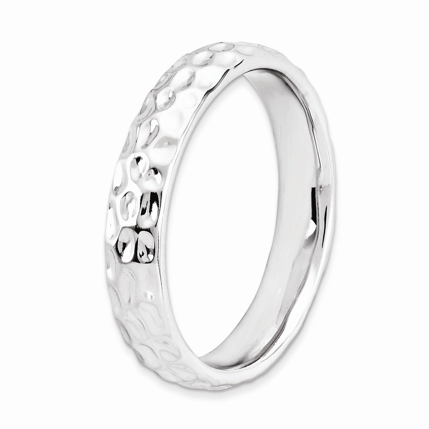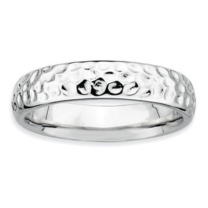 Make it simple and stylish with bands of different textures, finishes, widths and colors! This rhodium plated sterling silver band features a hammered design with a high polished finish that measures 4. Mm wide. Guaranteed to fit together perfectly with all of the mix and match Stackable Expressions rings. This item is backordered. Please allow 7-10 business days for delivery