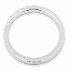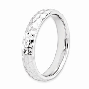 • Make it simple and stylish with bands of different textures, finishes, widths and colors! This rhodium plated sterling silver band features a hammered design with a high polished finish that measures 4. Mm wide. Guaranteed to fit together perfectly with all of the mix and match Stackable Expressions rings. This item is backordered. Please allow 7-10 business days for delivery