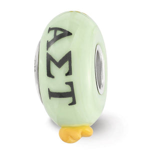 Go Greek and celebrate sisterhood with a handcrafted sorority glass charm by Fenton. Each meticulously hand-blown hand-painted glass charm is initialed by the artist and finished with a ceramic glaze and a sterling silver core embossed with Fenton USA! This green charm features the Alpha Sigma Tau design and is approximately 8mm in width by 15mm in length. Fenton Made in America handcrafted glass beads are interchangeable as well as compatible with other popular 3mm width bead style bracelets and necklaces. Colors and size may vary slightly.