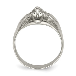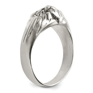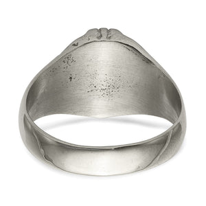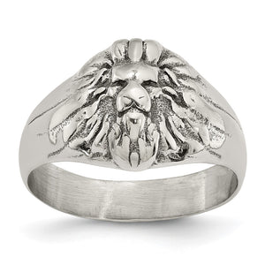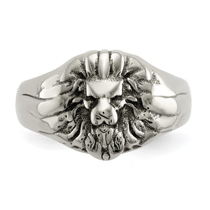 Rugged masculine style created from antiqued and polished stainless steel. This tapered fit ring features an embossed carved lion's head. It is approximately 13mm (1/2 inch) in width across the top. Available in whole sizes only 9-12.