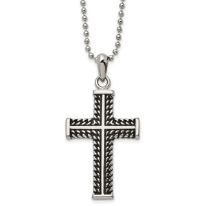 Men's Stainless Steel Antiqued and Polished Cross Necklace, 22 Inch