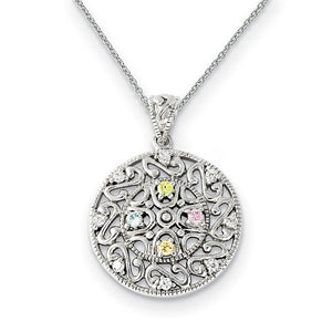 The elaborate open design of this 1 inch rhodium plated sterling silver pendant is prong set with 12 multicolor cubic zirconia stones. It includes a matching 18 inch cable chain and a card with the following poem written by the artist printed in English and Spanish. BLISS - There's a lesson I've learned. Listen closely for it is this. Even in sorrowful times, you can always find bliss. Don't look at the bad but see what lies ahead. Keep hope in your heart for it has been well said. When you keep moving on and despair you dismiss, at the end of your trial you are sure to find bliss.
