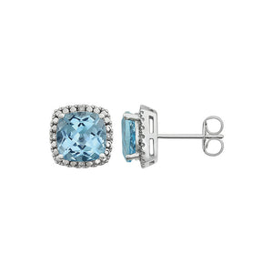 A classic design with a brilliant sparkle! These square gemstone earrings feature an 8mm cushion-cut sky blue topaz and white diamond accents prong set in 14k white gold. They are approximately 10mm wide by 10mm (3/8 inch) long. The eight diamonds are I3 in clarity, H-J in color and the total weight for the pair is .056 carat. The genuine topaz weight for the pair is 5.6 carats. Color range varies on all natural stones so please allow for slight variations in shades. Gemstone treatment: irradiated enhancement. Diamond treatment: natural, not enhanced.