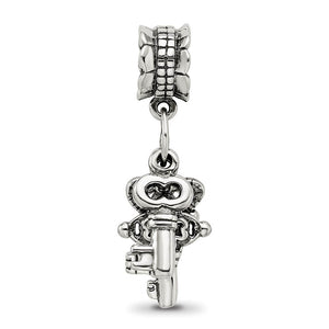 Dangling charms are a fun way to add movement and intrigue to your artisan expression jewelry. Fashioned from sterling silver with an oxidized finish to bring out every detail, this set of keys hangs from a ruffled bead that features a 4mm core. It is also interchangeable as well as compatible with Reflections and other popular 3mm width bead style bracelets and necklaces.