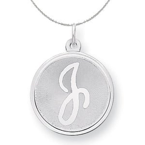 The 20mm (3/4 inch) brocaded disc with its contrasting satin and polished design adds a touch of glamour to your favorite initial. It is fashioned from solid sterling silver, finished with a classic jump ring that fits up to a 3mm width chain and has a polished back that is suitable for engraving. Includes a 1.25mm, 20 inch sterling silver cable chain.
