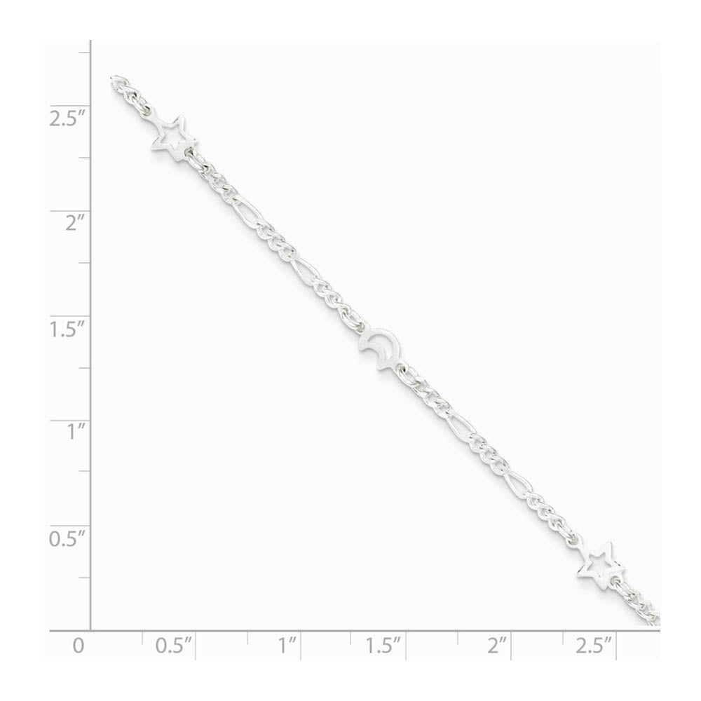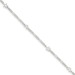 Make a summer fashion statement with this sterling silver bracelet that adds unexpected shimmer around your ankle. A fancy lobster clasp keeps this stylish, 2mm Figaro chain safely in place. It is adjustable in length from 9 to 10 inches and features 6mm moon and star charms.