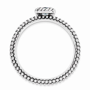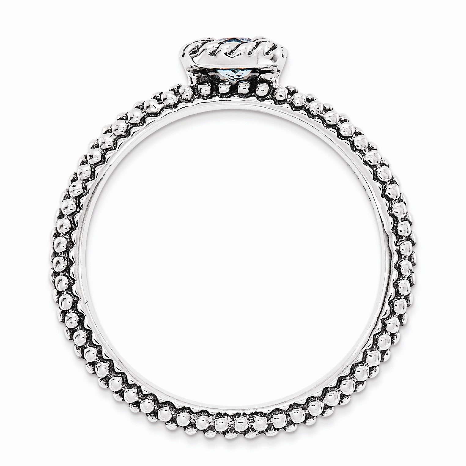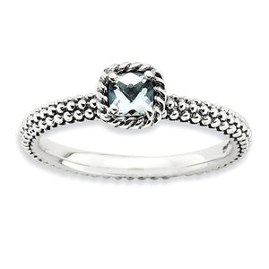 Featured atop a 2. Mm antiqued sterling silver band finished with milgrain detailing is a checkerboard cut aquamarine gemstone prong set in a 7mm square rope mounting. Wear it alone or featured in a collection. Guaranteed to fit together perfectly with all of the mix and match Stackable Expressions rings.