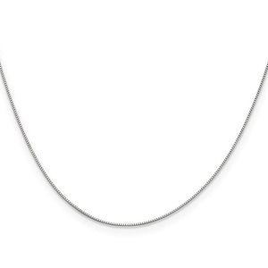 • Simple, classic and ready for your favorite pendant. This delicate 0.5mm width, 18-inch long, box chain necklace is created from rhodium-plated 14k white gold and closes with a lobster claw clasp.