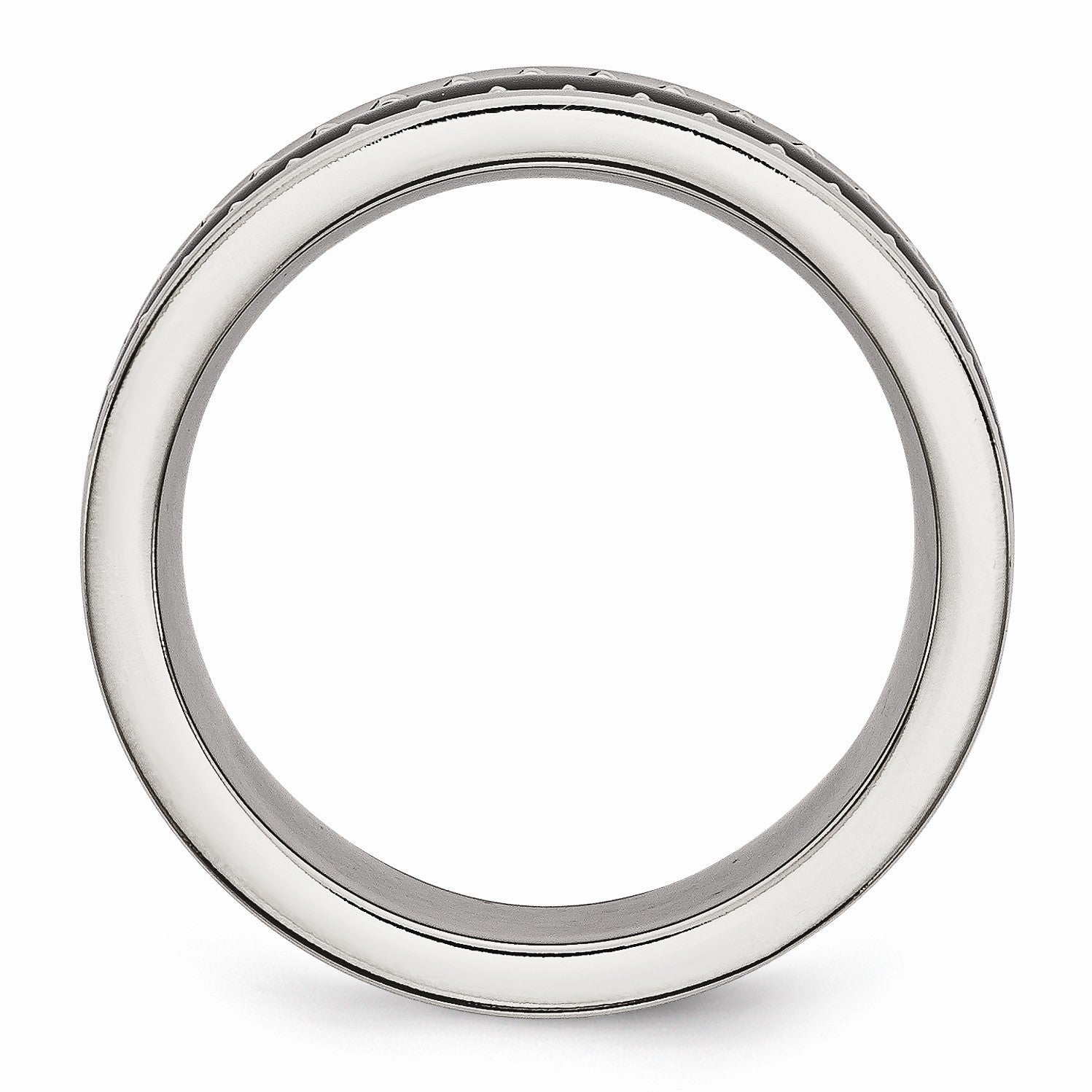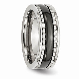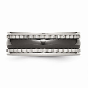 A stylish contemporary design created from 316L stainless steel with a low dome black ceramic center. This polished high contrast band is 8mm in width, finished with a standard fit interior and is suitable for engraving.