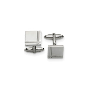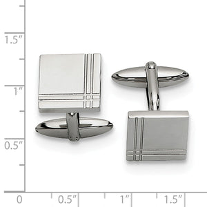 Refine your subtle style with these polished stainless steel cuff links featuring a double grooved edge design that is suitable for engraving and a bullet back closure. The flat tops are approximately 15mm (9/16 inch) in width by 13mm (1/2 inch) in length.
