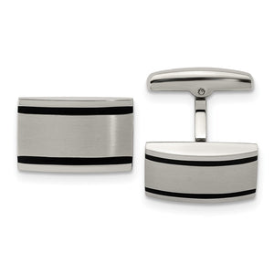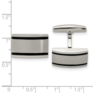 Classic elegance, perfect for every occasion! These rectangular stainless-steel cuff links feature a brushed and polished finish, black rubber stripes and convex design with a whale back toggle clasp. They are approximately 20mm (3/4 inch) in width by 12mm (7/16 inch) in length. Suitable for engraving.