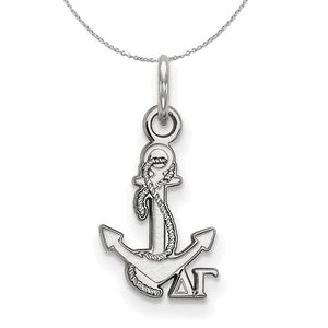 Show your greek life spirit with this Delta Gamma Sorority pendant necklace. It is crafted with rhodium plated sterling silver and without the bail is 13mm in height and 9mm in width (0.51 in x 0.35 in). With the bail, the measurements are 18mm in height and 9mm in width. We are a certified LogoArt retailer and this authentic item is licensed by the Delta Gamma Sorority and Greek Life. This pendant necklace is made the USA. Includes a 20 Inch, 1.25mm cable chain.