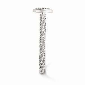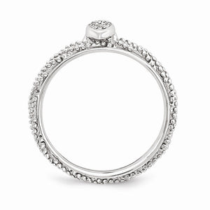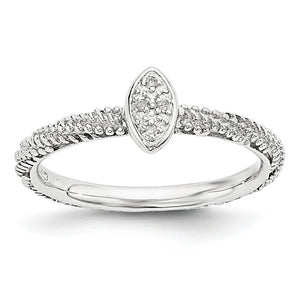 Create a look that is all your own with a fun assortment of rings that looks great alone or stacked in a collection to express your own unique style. This textured ring fashioned from tarnish resistant rhodium plated sterling silver features a 7 x 4mm marquise top with pave set genuine diamonds and a 2.5mm width milgrain band. The natural white diamonds are H-I in color, I3 clarity and the total diamond weight is 0.2 carat. Guaranteed to fit together perfectly with all of the mix and match Stackable Expressions rings.