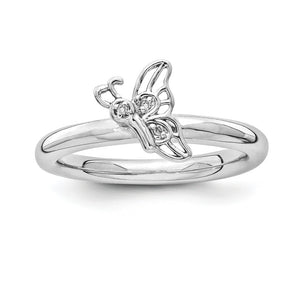 Create a look that is all your own with a fun assortment of rings that looks great alone or stacked in a collection to express your own unique style. This polished ring fashioned from tarnish resistant rhodium plated sterling silver features a 9mm butterfly pave set with three genuine diamonds and a 2. Mm width band. The natural white diamond is H-I in color, I3 clarity and the diamond weight is 0.15 carat. Guaranteed to fit together perfectly with all of the mix and match Stackable Expressions rings.