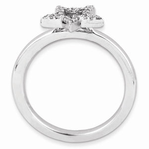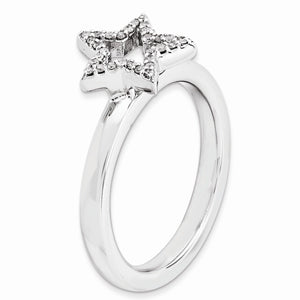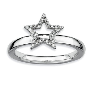 You cannot go wrong by adding a diamond ring to any stackable combination. This polished 2.5 band fashioned from rhodium plated sterling silver features a diamond studded open star. The 30 round, I3 clarity, H-I color diamonds total 1/10 of a carat. Guaranteed to fit together perfectly with all of the mix and match Stackable Expressions rings.