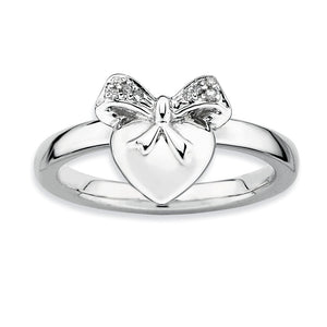 You cannot go wrong by adding a diamond ring to any stackable combination. This polished 2.5 band fashioned from rhodium plated sterling silver features a diamond bow accented heart. The 8 round, I3 clarity, H-I color diamonds total .24 of a carat. Guaranteed to fit together perfectly with all of the mix and match Stackable Expressions rings.