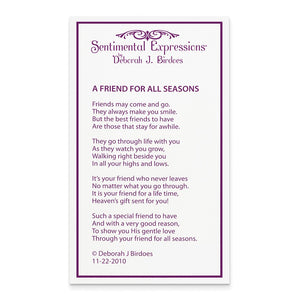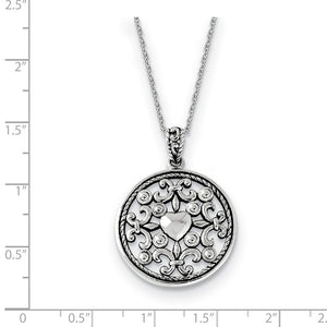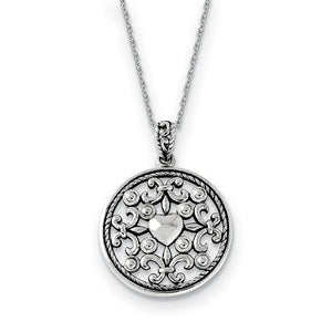 A 1-inch circle pendant fashioned from antiqued rhodium-plated sterling silver features a fleur de lis and heart design with a rope edge. It comes complete on an 18 inch rhodium-plated sterling silver cable chain finished with a spring ring clasp. Each necklace includes a card with the following artist poem printed in English and Spanish. A FRIEND FOR ALL SEASONS - Friends may come and go. They always make you smile. But the best friends to have are those that stay for awhile. They go through life with you as they watch you grow, walking right beside you in all your highs and lows. It's your friend who never leaves no matter what you go through. It is your friend for a lifetime, Heaven's gift sent for you! Such a special friend to have and with a very good reason, to show you His gentle love through your friend for all seasons.