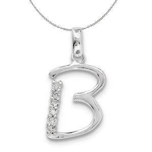 Adding a touch of glamour to your favorite initial is six prong-set clear cubic zirconia gemstones. This gleaming pendant is fashioned from sterling silver and will fit up to a 4mm width classic style chain. Each letter B is approximate 14mm (9/16 inch) in width by 24mm (15/16 inch) in length, which includes the bail. Includes a 1.25mm, 16 inch sterling silver cable chain.