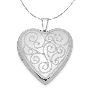 Show off your loved ones and keep them close with this 20mm heart locket fashioned from polished sterling silver featuring a textured swirl design. Opens to hold two small photos or keepsakes. Includes a 1.25mm, 18 inch sterling silver cable chain.