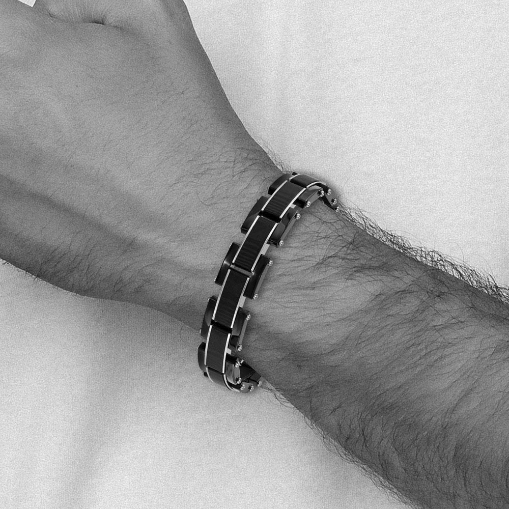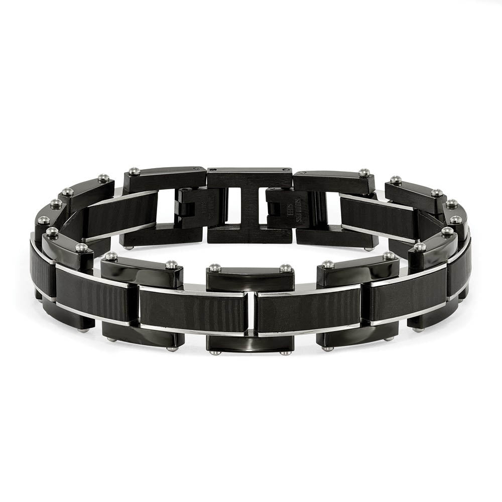 Dapper sophistication! This two-tone link bracelet is created from polished and black-plated stainless steel accented with solid black carbon fiber inlays. It is approximately 15mm (9/16 inch) in width by 8.5 inches in length, which includes the fold over clasp.