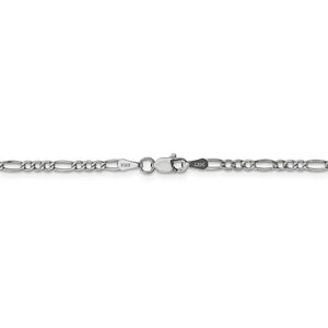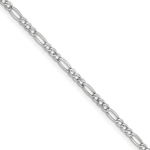 Round and rectangular hollow links made of rhodium-plated 14k white gold interlock in unique reoccurring three and one pattern that closes with a lobster claw clasp. The easy elegance of a Figaro chain looks great with dress or casual wear and the 2.5mm width provides versatility for both men and women.