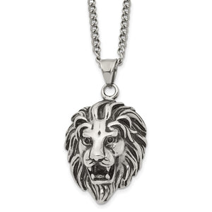 Daring, mesmerizing, eclectic style! This polished and antiqued stainless steel necklace features a large 3D hollow or open-back lion's head pendant that is approximately 30mm (1 3/16 inch) in width by 54mm (2 1/8 inch) in length, which includes the bail. It hangs on a 2.8mm width, 24-inch long polished curb chain that closes with a fancy lobster clasp.