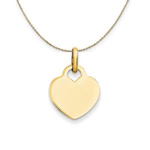 • This heart charm pendant is crafted with polished 14 karat yellow gold and it features a solid design and is engravable. The approximate size is 15 mm x 21 mm with the bail. Includes a 18 inch long, 0.9mm wide, solid 14k yellow gold cable chain with a spring ring clasp.