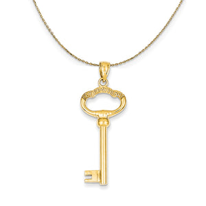 This key to my heart pendant is crafted with polished 14 karat yellow gold and it features a three dimensional design with an inscription. The approximate size is 15 mm x 42 mm and its average item weight is 3.82 grams. Includes a 20 inch long, 0.9mm wide, solid 14k yellow gold cable chain with a spring ring clasp.