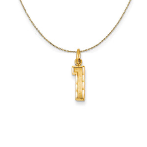 Celebrate your favorite sports player, lucky number or milestone date in your life with a prominent 14k yellow gold charm. This satin and diamond cut number is approximately 12mm (7/16 Inch) in length and is finished with a classic jump ring. The pendant is . Includes a 20 inch, 0.8mm 14k yellow gold cable chain with a lobster clasp.