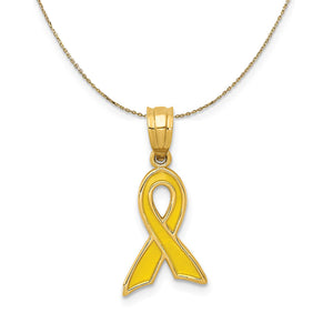 A yellow ribbon is a general symbol of hope and most commonly used to support our troops but it is also used for bone cancer awareness and suicide prevention. This yellow enamel and 14k yellow gold ribbon is approximately 10mm (3/8 inch) in width by 20mm (3/4 inch) in length with the bail. Each color ribbon may represent more causes than identified and some causes may also be identified by more than one color. Includes a 16 inch long, 0.9mm wide, solid 14k yellow gold cable chain with a spring ring clasp.