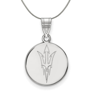 • If you are a fan of Arizona State University and the Sun Devils then you need to show your school spirit with this Arizona State University necklace. We are a certified college jewelry retailer and this authentic item is officially licensed. It is crafted from Sterling Silver and crafted by LogoArt in the USA. Includes a 20 Inch, 1.25mm sterling silver franco chain.