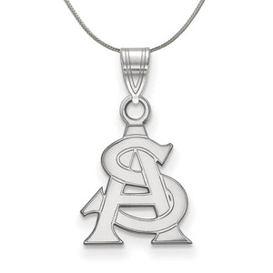 • If you are a fan of Arizona State University and the Sun Devils then you need to show your school spirit with this Arizona State University necklace. We are a certified college jewelry retailer and this authentic item is officially licensed. It is crafted from Sterling Silver and crafted by LogoArt in the USA. Includes a 20 Inch, 1.25mm sterling silver franco chain.