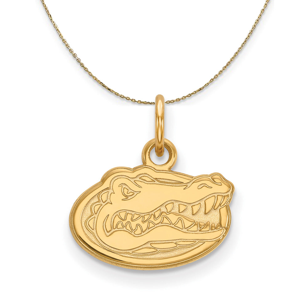 • If you are a fan of The University of Florida and the Gators then you need to show your school spirit with this University of Florida pendant. We are a certified college jewelry retailer and this authentic item is officially licensed. It is crafted from 14k Yellow Gold and crafted by LogoArt in the USA. Includes a 18 inch, 0.8mm 14k yellow gold cable chain with a lobster clasp.
