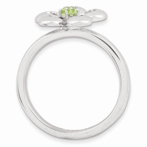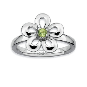Peridot, August's birthstone is known to bring wealth and prosperity; it also symbolizes friendliness, purity and simplicity. This 2.5mm smooth polished band fashioned from rhodium plated sterling silver features a flower with sterling silver looped petals and a prong set faceted peridot in the center. Guaranteed to fit together perfectly with all of the mix and match Stackable Expressions rings.