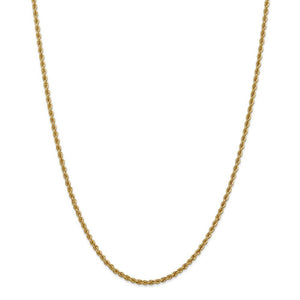 A traditional 14k yellow gold rope chain measuring 2.5mm in width is handmade and closes with a lobster claw clasp. Its versatile, solid link design is ideal for men and women. 18 inches in length.