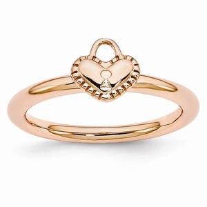 Create a look that is all your own with a fun assortment of rings that looks great alone or stacked in a collection to express your own unique style. This polished ring fashioned from rose gold plated sterling silver features an 8 x 7mm heart padlock atop a 2.5mm width band. Guaranteed to fit together perfectly with all of the mix and match Stackable Expressions rings.