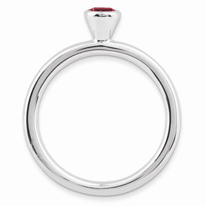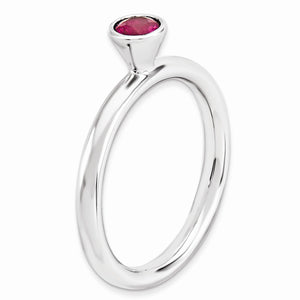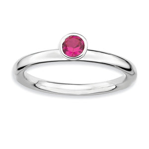 Created Ruby, July's birthstone is known as the stone of spiritual wisdom, health and knowledge bringing contentment and peace. This 2.5mm band fashioned from rhodium plated sterling silver is bezel set in a high profile mounting with a 4mm round gemstone that will stand out and make a statement. Created rubies like their natural counterparts can range from pink to deep red so please allow for variations in color. Guaranteed to fit together perfectly with all of the mix and match Stackable Expressions rings.