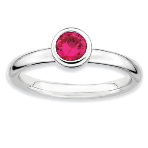 Created Ruby, July's birthstone is known as the stone of spiritual wisdom, health and knowledge bringing contentment and peace. This 2.5mm band fashioned from rhodium plated sterling silver is bezel set in a low profile mounting with a 5mm round gemstone that will add vibrant color to your finger. Created rubies like their natural counterparts can range from pink to deep red so please allow for variations in color. Guaranteed to fit together perfectly with all of the mix and match Stackable Expressions rings.