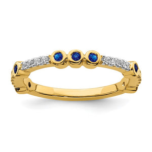 Make it simple and stylish with bands of different textures, finishes, widths and colors or extravagant with diamonds and gemstones! This stackable ring created from solid 14k yellow gold features 5 bezel set lab created-sapphire gemstones totaling 1/6 of a carat and 8 prong set genuine diamonds totaling .8 of a carat. The natural diamonds are I2 in clarity and I-J in color. The approximate band width is 2mm. Guaranteed to fit together perfectly with all of the mix and match Stackable Expressions rings. The color range varies on all lab created gemstones so please allow for slight variations in shades (medium navy to royal blue). The color on your screen may also not reflect actual gemstone color due to variations in monitors.