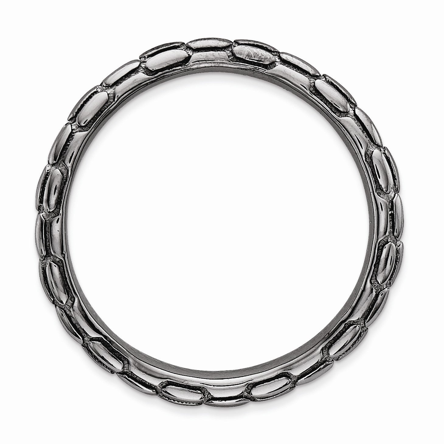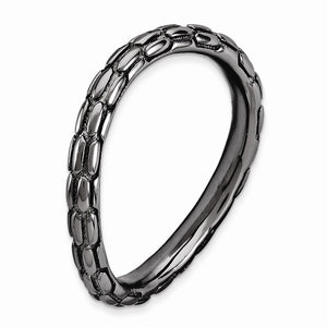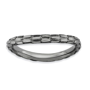 Contemporary geometric style! Create a unique stacked design with curved bands of different colors, patterns and widths. This 2.5mm band fashioned from sterling silver features a polished black ruthenium-plated finish, a gentle wave shape and a rice pattern. Wear it alone or stack with other curved bands only.